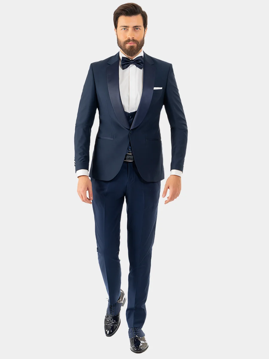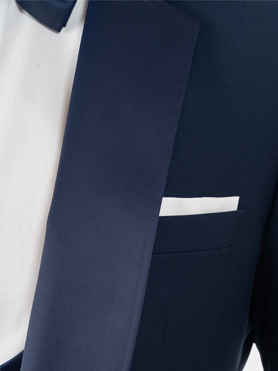 Cut to a slim, well-defined fit, this handsome tuxedo features a slightly curved silk-covered peak lapel, a single silk-covered button, silk-lined jetted pockets and lightly padded shoulders. A true standout among its peers with its black and navy colors, and a perfect choice for you wedding events.