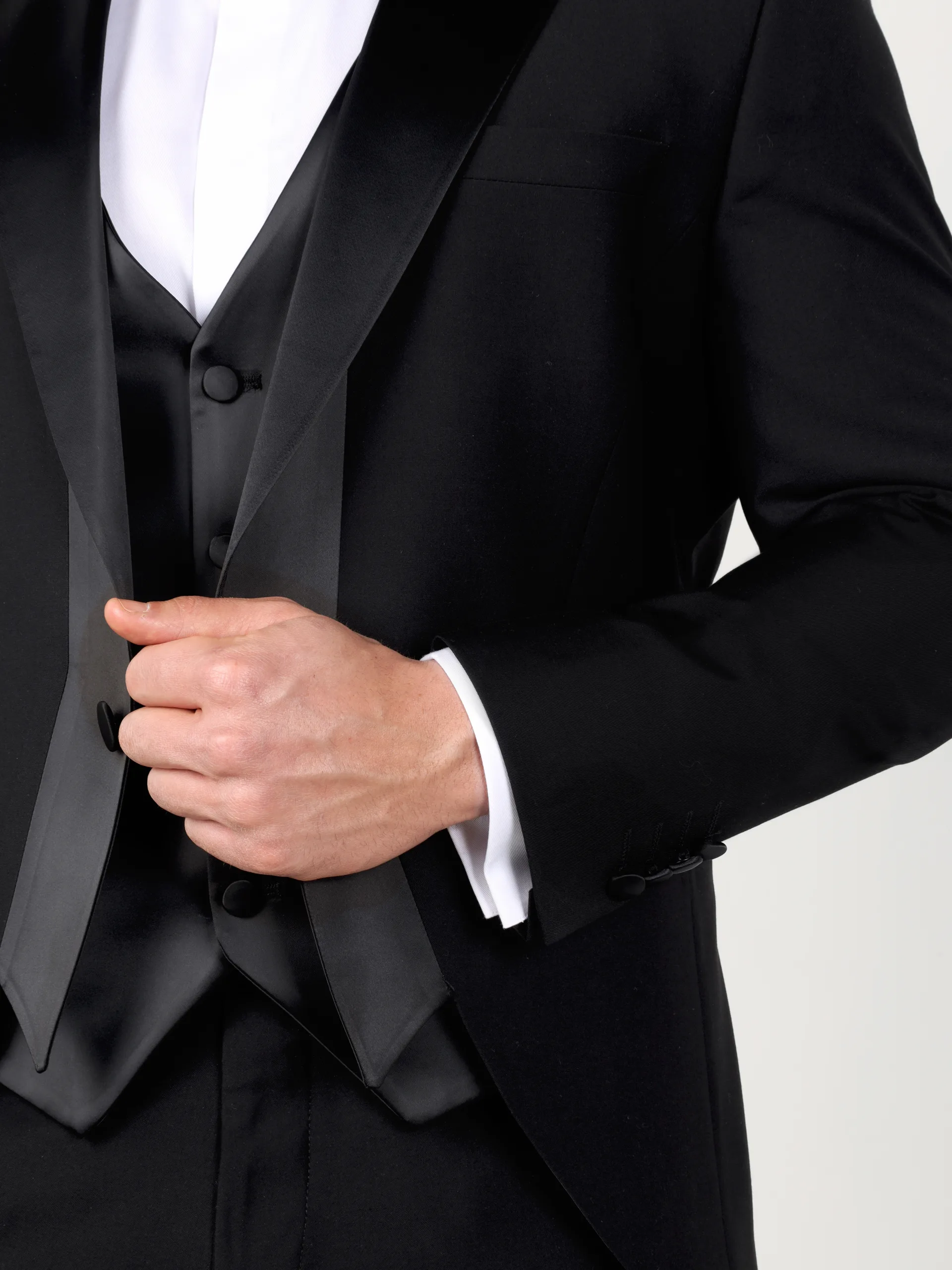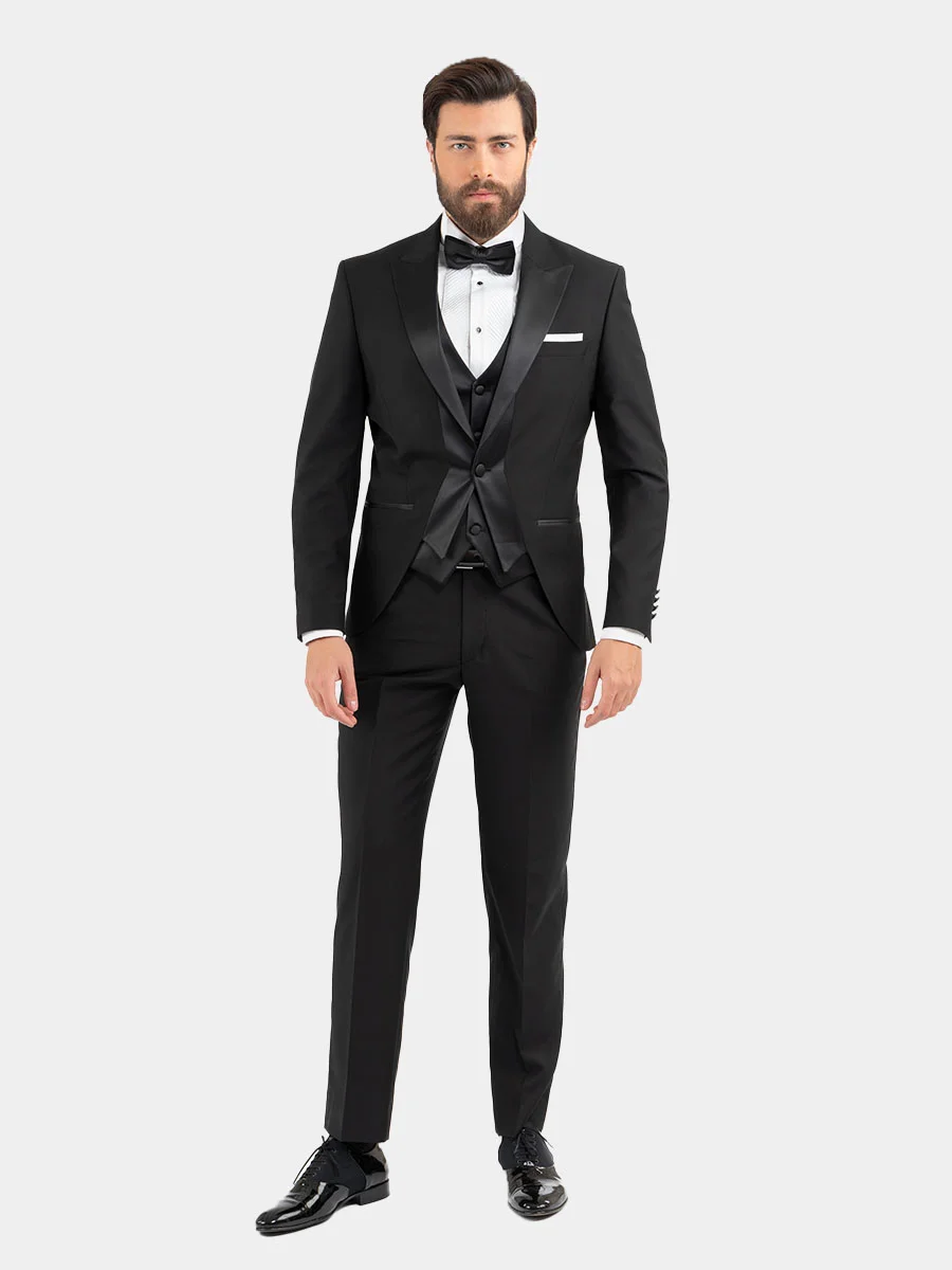 Tailored slim with a slightly curved silk-covered peak lapel, a single silk-covered button and lightly padded shoulders, this stunning black Firenze tuxedo cut comes paired with our Pellini trousers and vest, a perfect choice for wedding events.