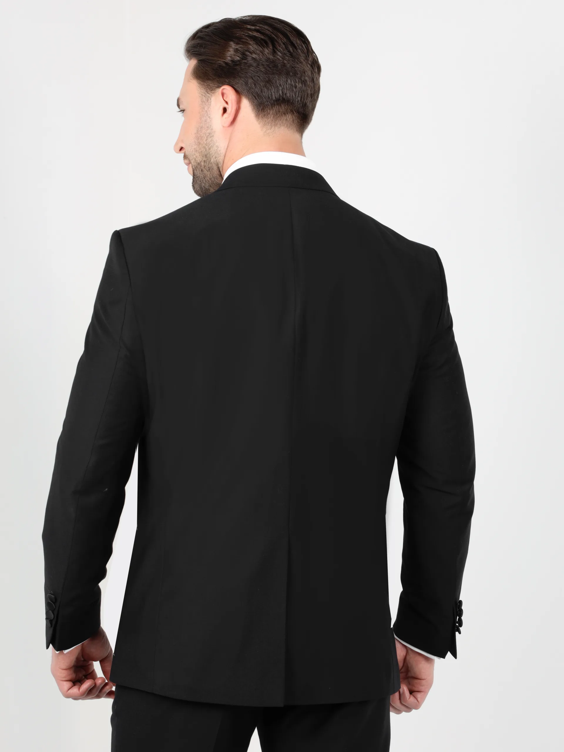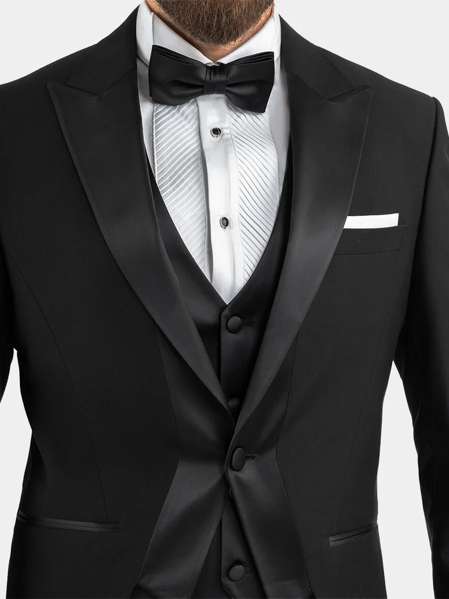 Tailored slim with a slightly curved silk-covered peak lapel, a single silk-covered button and lightly padded shoulders, this stunning black Firenze tuxedo cut comes paired with our Pellini trousers and vest, a perfect choice for wedding events.
