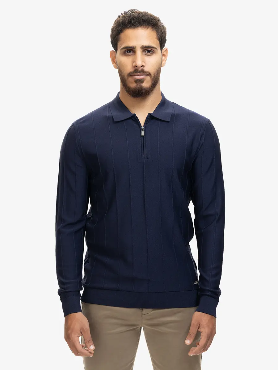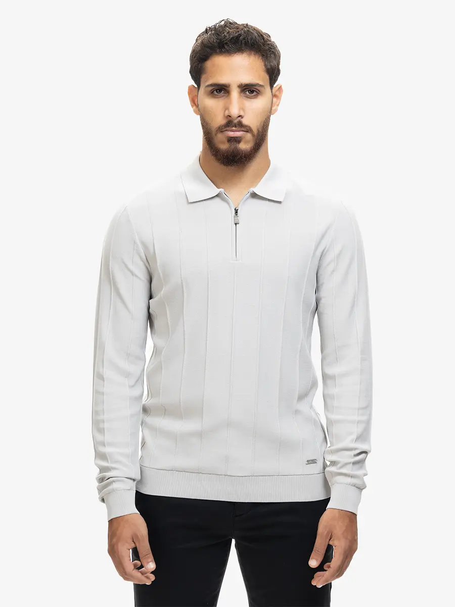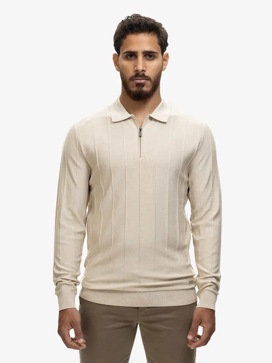 Crafted from a soft natural rayon blend, this zip polo sweater offers a smooth, lightweight feel with an elevated, modern look. The refined vertical knit pattern adds subtle structure, while the half-zip neckline brings a touch of sporty sophistication. Its breathable, drapey fabric makes it ideal for both smart and casual styling throughout the season.