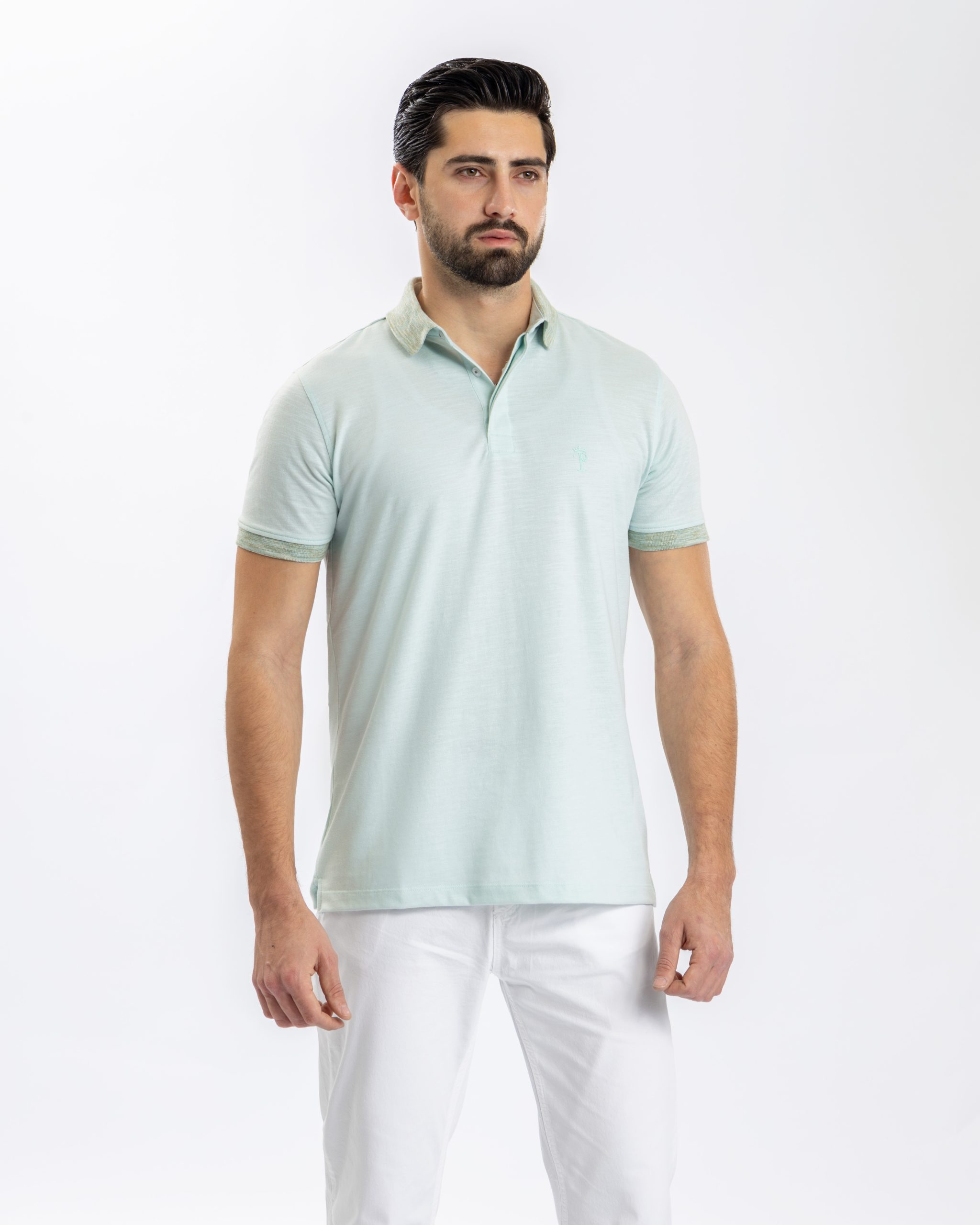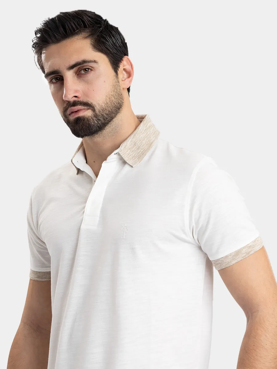 Designed for warm days, it features a relaxed fit, soft texture, and contrast knit details on the collar and sleeve hems for a subtle yet elevated finish.