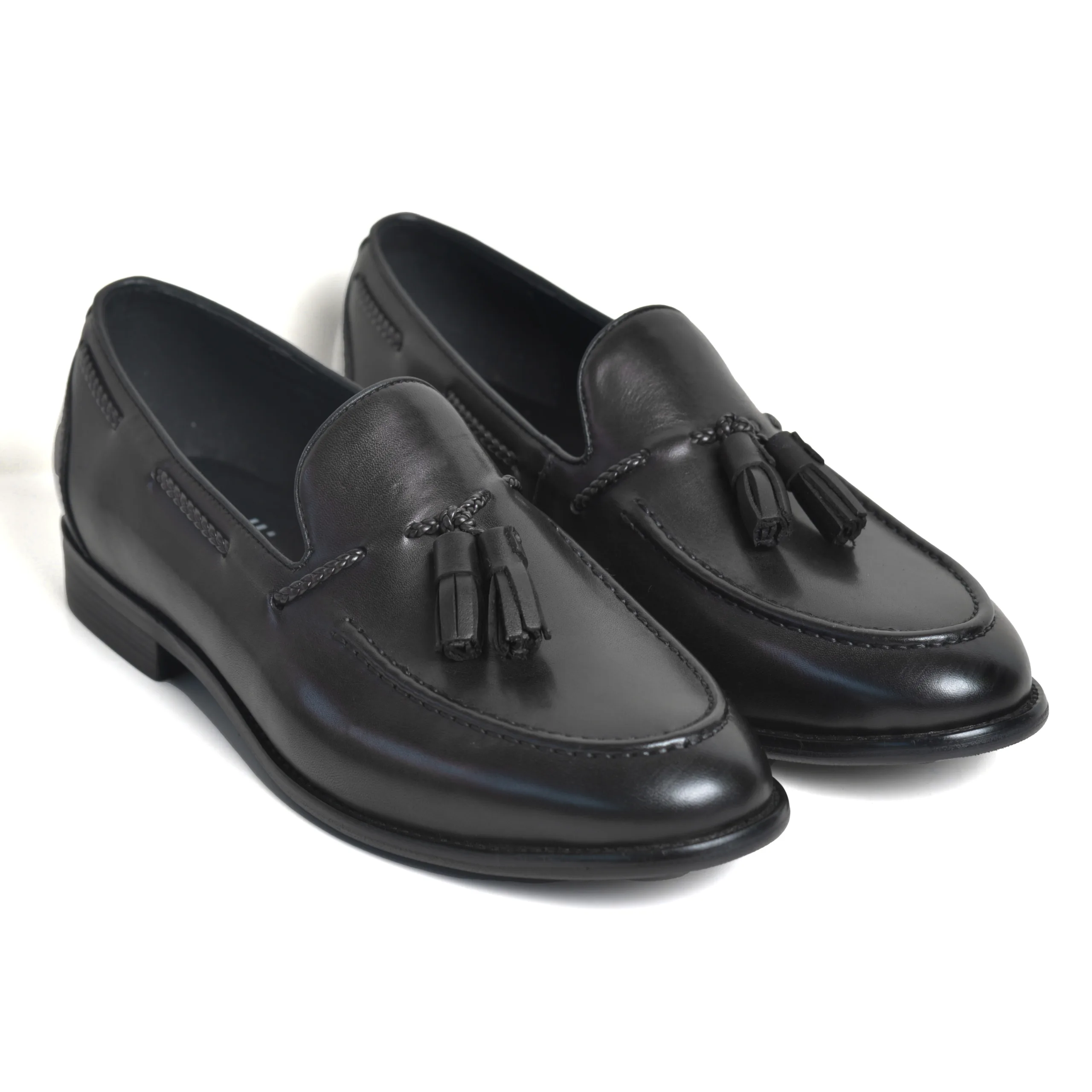 Leather loafers are shaped to a slip-on design with almond toes, featuring brown and black colors.