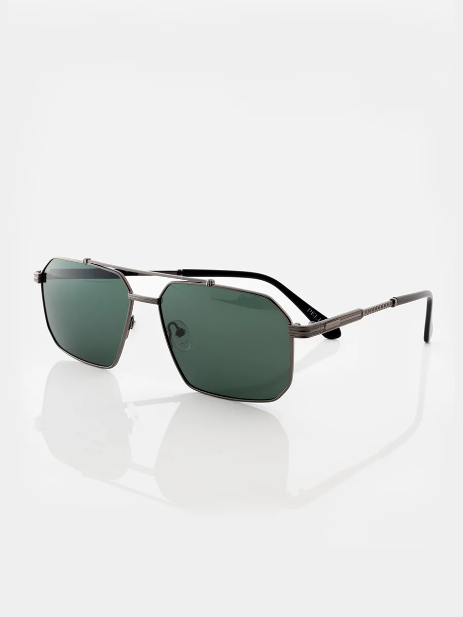 Elevate your summer look with these geometric sunglasses, featuring a sleek gunmetal frame and dark green lenses for a bold, contemporary style.