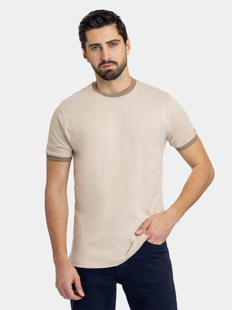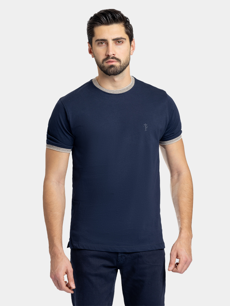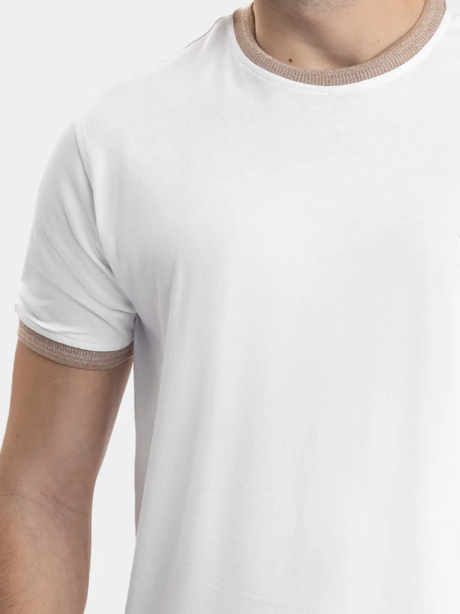 A modern twist on a classic. This round neck T-shirt features a contrast-colored neckline for a subtle pop of style, perfect for casual everyday wear.