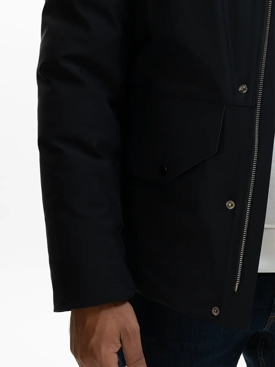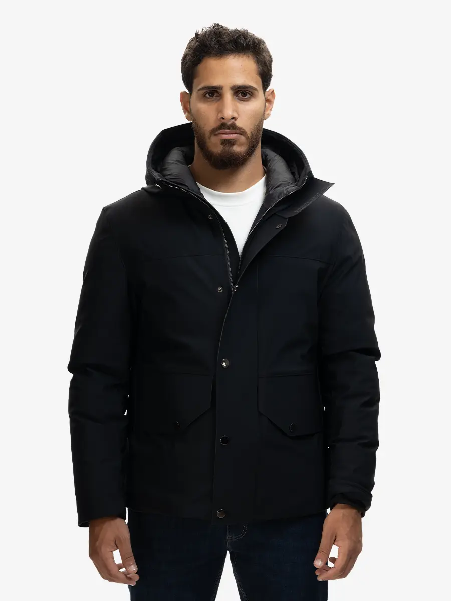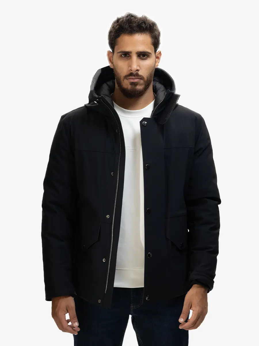 A warm and durable winter bomber jacket crafted with padded insulation for superior comfort in cold weather. Designed with a fixed hood, snap-button closures, and practical front flap pockets for everyday use. Its structured fit and clean lines give a modern, versatile look suitable for any casual winter outfit.