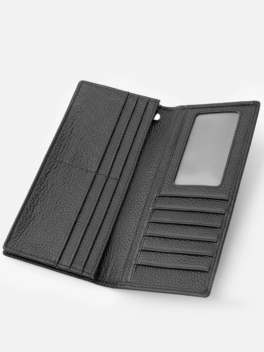 Crafted from premium textured leather, this black zip wallet is designed for functionality and refined everyday use. It features a full-zip closure, multiple card slots, a transparent ID window, and spacious compartments for cash and receipts—all organized in a sleek, slim profile.